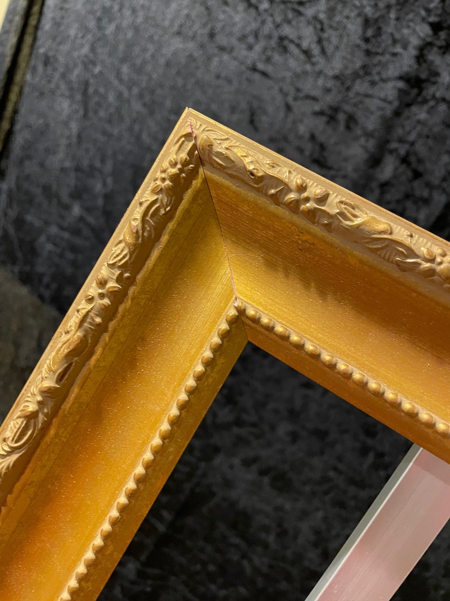 Wood Frame, custom made to your size specifications from vintage wood frame moulding. Moulding has been in storage for close to 50 years, so there are some natural defects here and there, but overall in excellent shape. This frame is hardwood and the color seems to have areas that have deglazed. Still a beautiful frame, but something to take into consideration before purchasing. Also, because glaze is a bit brittle, there is typically some chipping at the seams, however we will do our best to camouflage with a furniture marker.